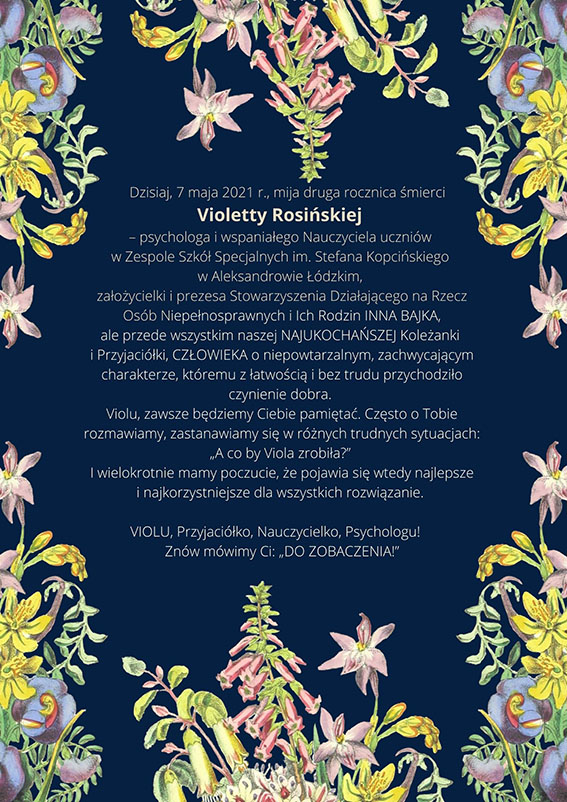 Szkolny psycholog, założyciel i prezes Stowarzyszenia INNA BAJKA. Przyjaciel. Inspiracja. Dobry człowiek. Swoją postawą uczyła nas jak ważne w życiu jest bezinteresowne pomaganie innym. Pracowita, skromna, szalenie kreatywna. Angażowała się we wszystko całym sercem i robiła to w 100 procentach. Zarażała energią i poczuciem humoru. Żyła pełnią życia według zasad , które ceniła. Troszczyła się o każdego człowieka. Zawsze otwarta na problemy innych nigdy nie odmawiała pomocy. Zawsze znajdowała czas by porozmawiać, doradzić, pomóc rozwiązać problemy, podnieść na duchu. Szanowała i ceniła każdego wydobywając z innych to co dobre. Celem jej stowarzyszeniowej działalności było wspieranie osób niepełnosprawnych i ich rodzin.